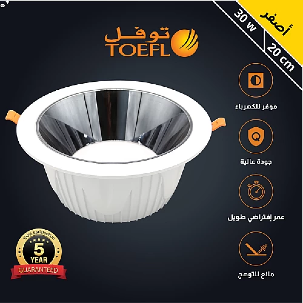 لون الانارة : اصفرالقدرة : 30 واطدرجة حرارة اللون (الكلفن) : 3000Kمقاس اطار التركيب : (8 بوصة)/(20 سم)الجهد الكهربائي : 220Vلون الغطاء : إطار مانع للتوهج Anti-Glareعدد سنوات الضمان : 5 سنة