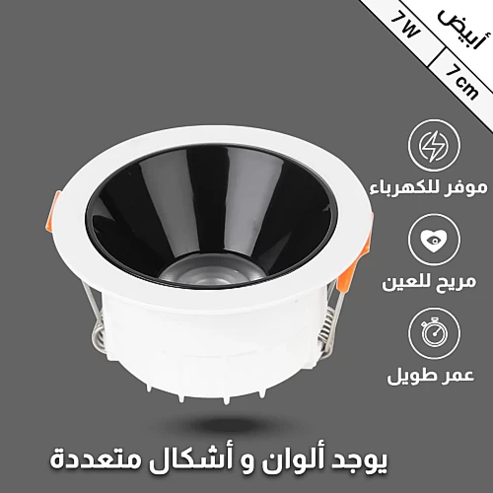لون الانارة : ابيضالقدرة : 7 واطدرجة حرارة اللون (الكلفن) : 6500kمقاس اطار التركيب : (2.5 بوصة)/(7 سم)الجهد الكهربائي : 220Vلون الغطاء : إطار مانع للتوهج Anti-Glareعدد سنوات الضمان : 3 سنة