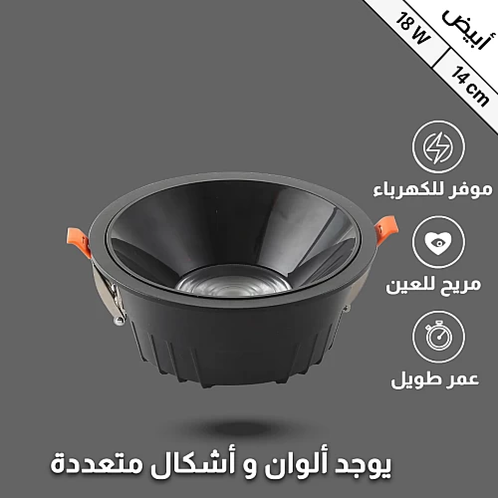 لون الانارة : ابيضالقدرة : 18 واطدرجة حرارة اللون (الكلفن) : 6500kمقاس اطار التركيب : (5 بوصة)/(14 سم)الجهد الكهربائي : 220Vلون الغطاء : إطار مانع للتوهج Anti-Glareعدد سنوات الضمان : 2 سنة