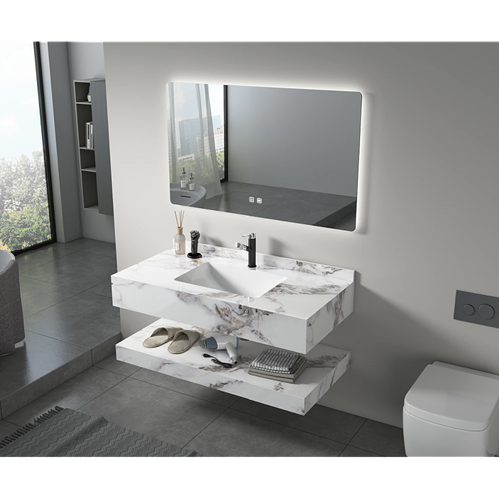 مغسلة رخام دورين ابيض عروق رمادي بني مع مراية ليد 3 قطع (تُضاف رسوم الأوزان الثقيلة)