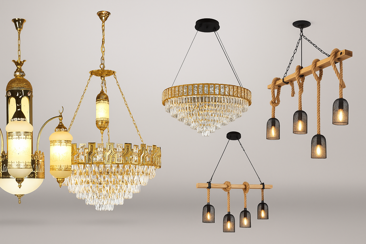 يجب أن تتناسق الثريا مع أسلوب الديكور العام للغرفة. إليك أبرز الأنماط المنتشرة في السوق السعودي:
