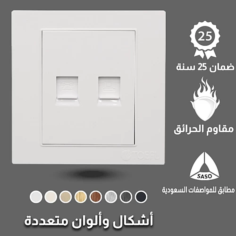 نوع المفتاح : فيش كمبيوتر مع هاتفابعاد المنتج : 7x7cmنوع التركيب : غاطس في الحائطلون الغطاء : ابيضعدد سنوات الضمان : 25 سنة