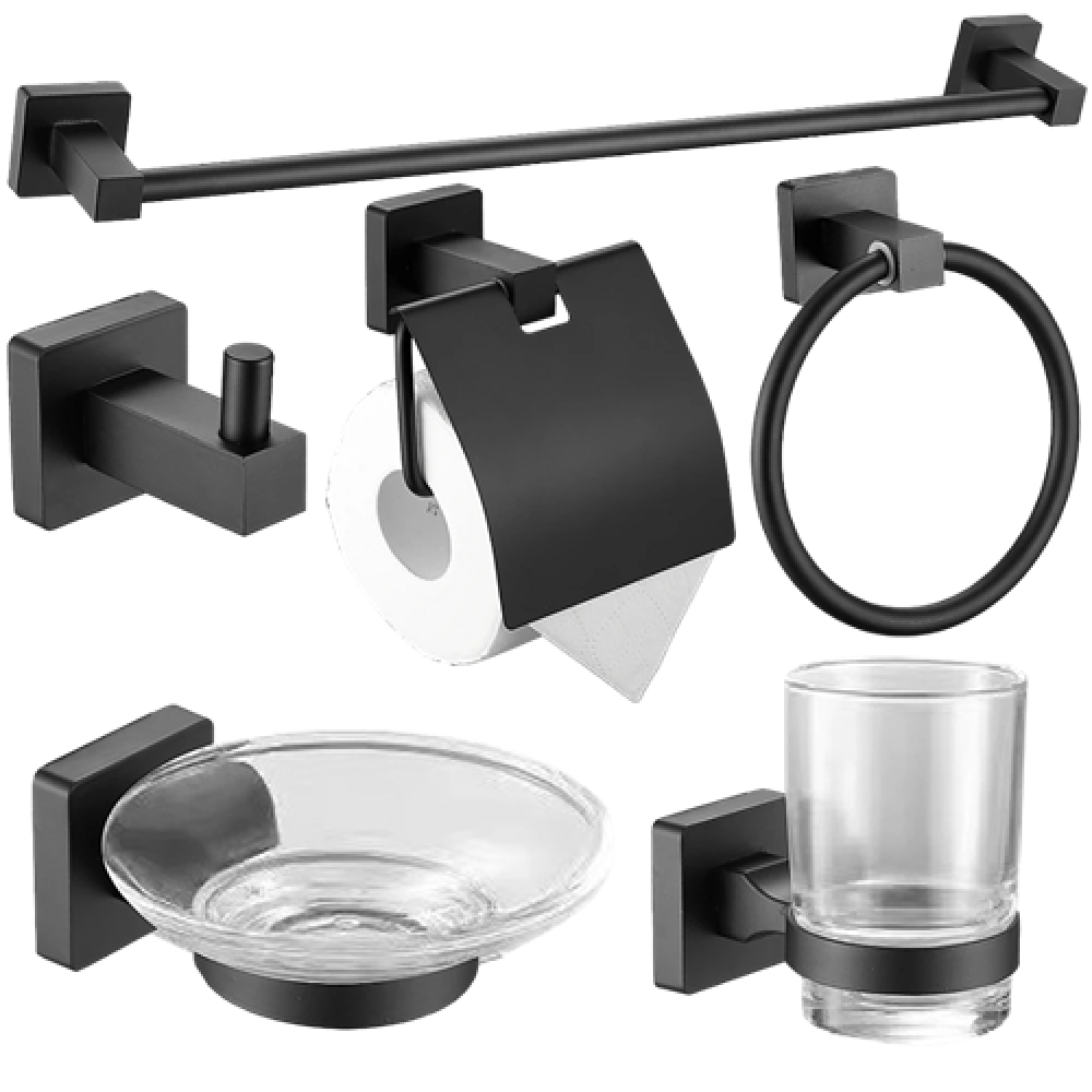 المواد المصنعة: ستانلس ستيلابعاد المنتج : TOWEL BAR:600*70*50MM TOWEL RING:165*68*185MM TISSUE HOLDER:145*110*97MM SOAP DISH:108*118*52MM TOOTH GLASS:66*95*92MM CLOTHES-HOOK:50*70*50MMلون الغطاء: اسودعدد سنوات الضمان: 3 سنوات (صدا)