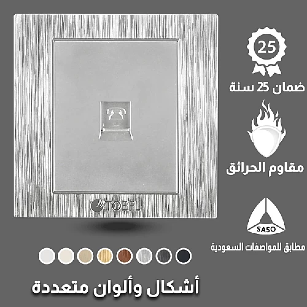 نوع المفتاح : مفتاح تلفونابعاد المنتج : 7x7cmنوع التركيب : غاطس في الحائطلون الغطاء : فضيعدد سنوات الضمان : 25 سنة