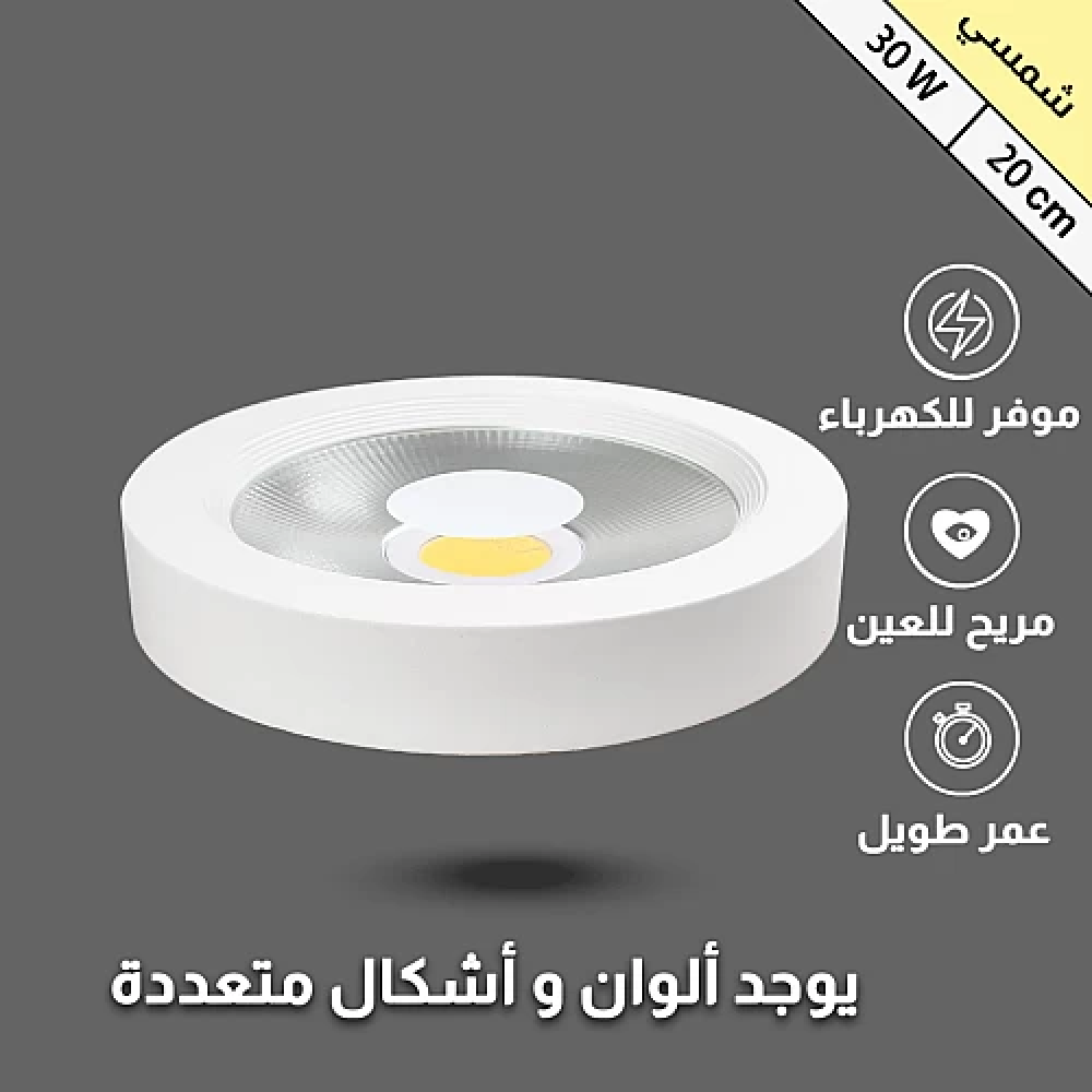لون الانارة : شمسي كريميالقدرة : 30 واطدرجة حرارة اللون (الكلفن) : 4000kمقاس اطار التركيب : (8 بوصة)/(20 سم)الجهد الكهربائي : 220Vلون الغطاء : إطار شفاف عاكسعدد سنوات الضمان : 5 سنة