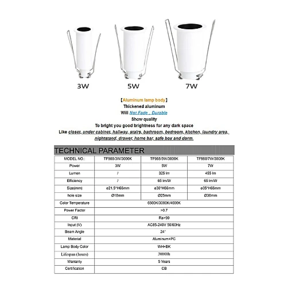 لون الانارة : اصفرالقدرة : 7 واطدرجة حرارة اللون (الكلفن) : 3000Kمقاس اطار التركيب : (1.2 بوصة)/(3 سم)الجهد الكهربائي : 220Vلون الغطاء : إطار شفاف عاكسعدد سنوات الضمان : 5 سنة