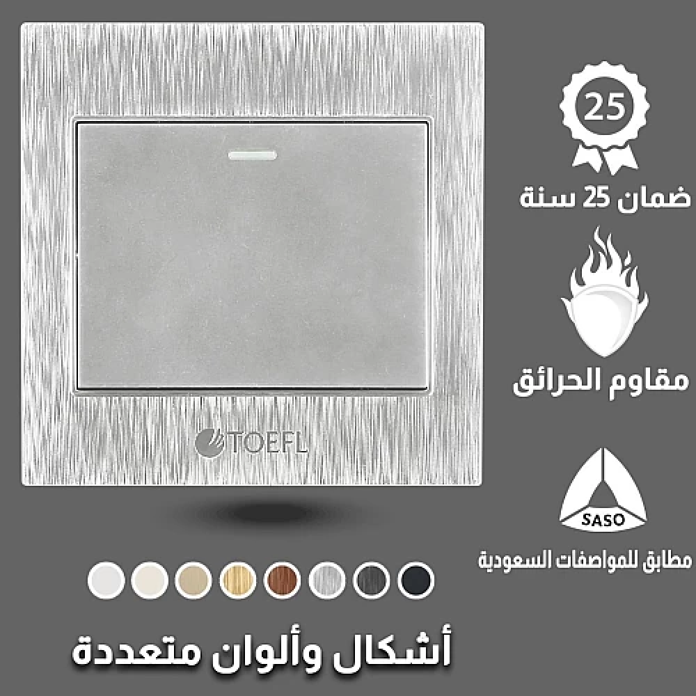 نوع المفتاح : مفتاح مفردابعاد المنتج : 7x7cmنوع التركيب : غاطس في الحائطلون الغطاء : فضيعدد سنوات الضمان : 25 سنة